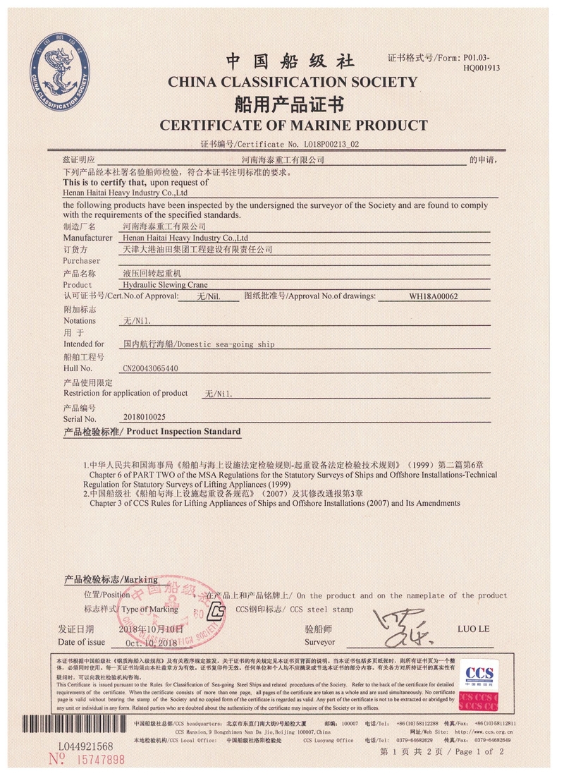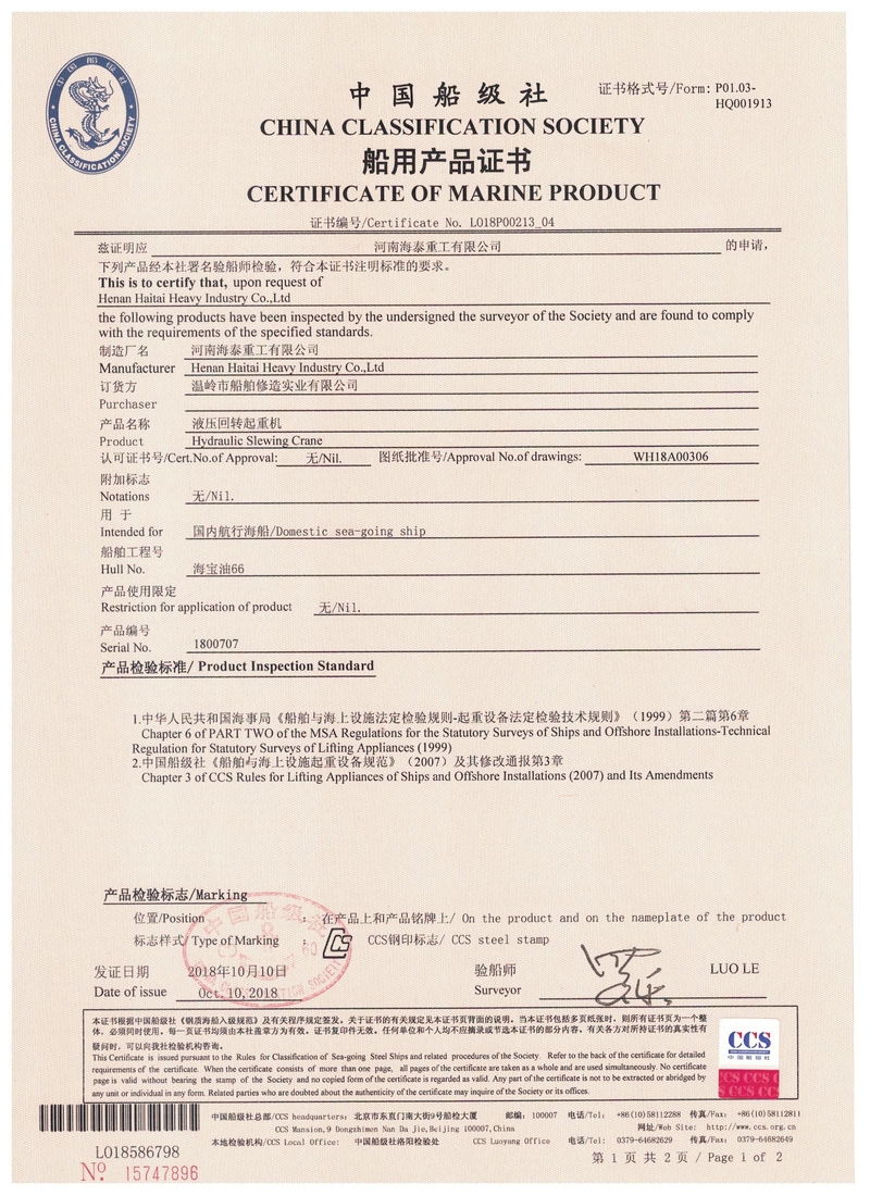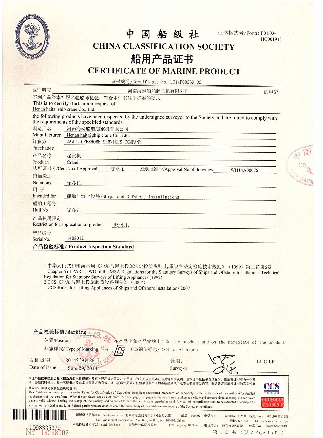 中國(guó)船級(jí)社CCS產(chǎn)品證書(shū)