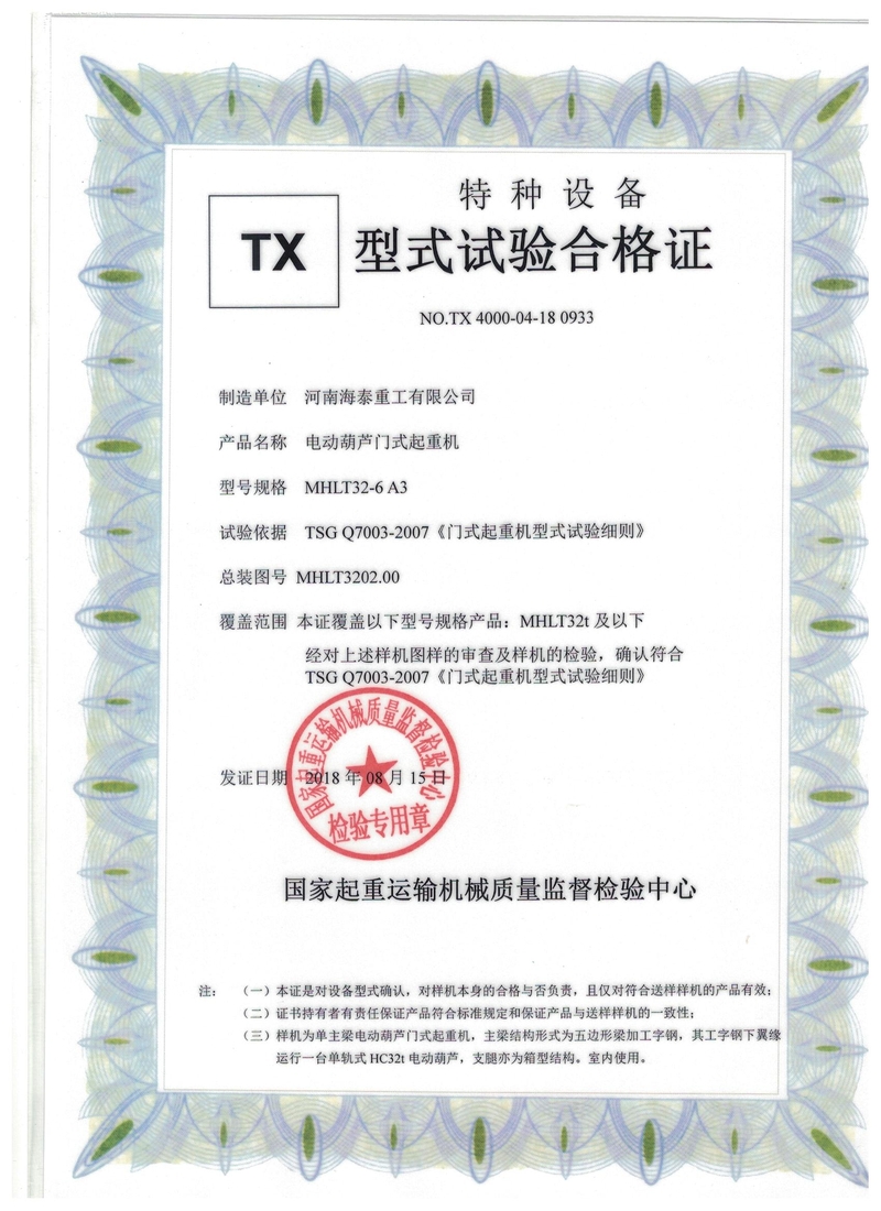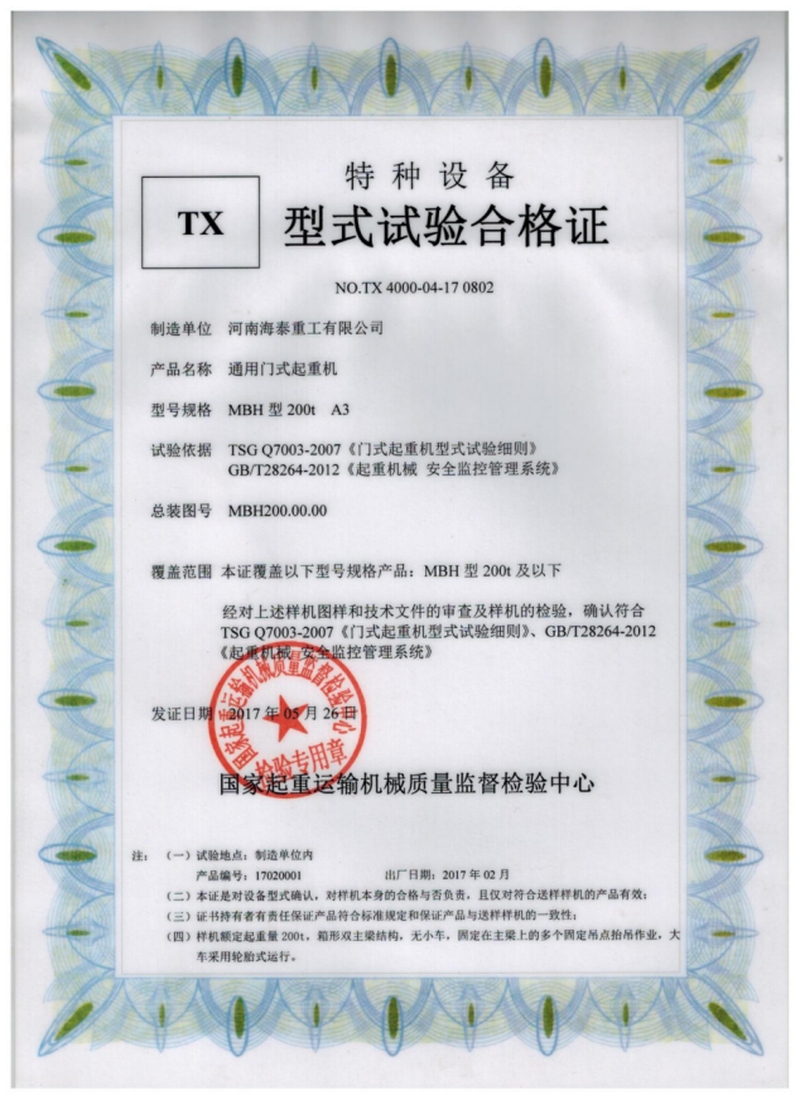 通用門(mén)式起重機(jī)特種設(shè)備TX型式試驗(yàn)合格證   電動(dòng)葫蘆門(mén)式起重機(jī)試驗(yàn)合格證書(shū)