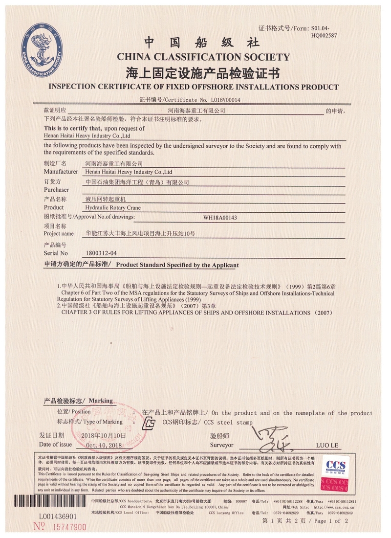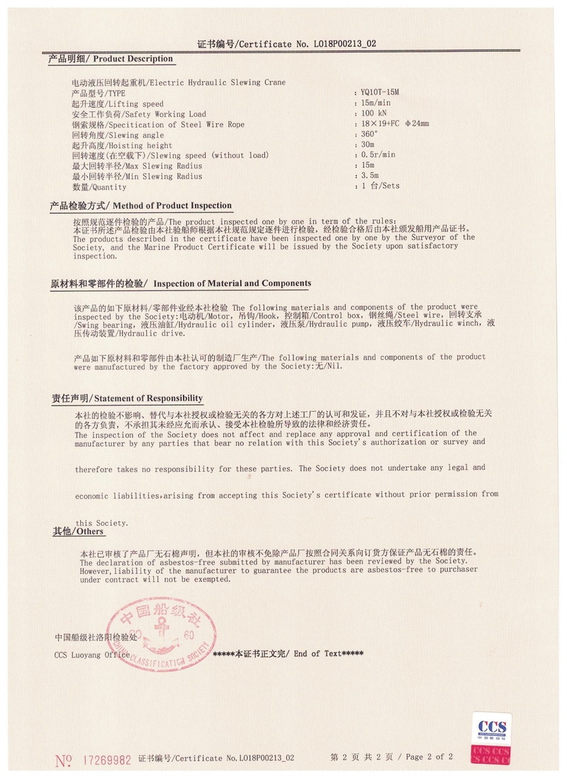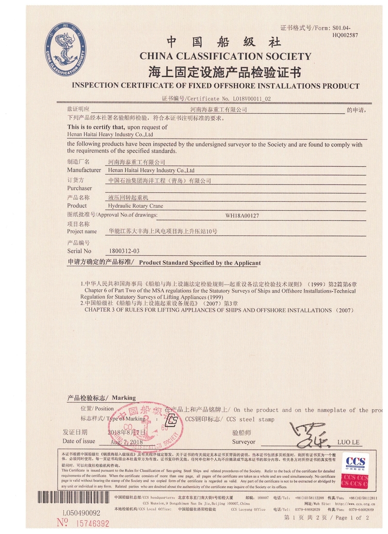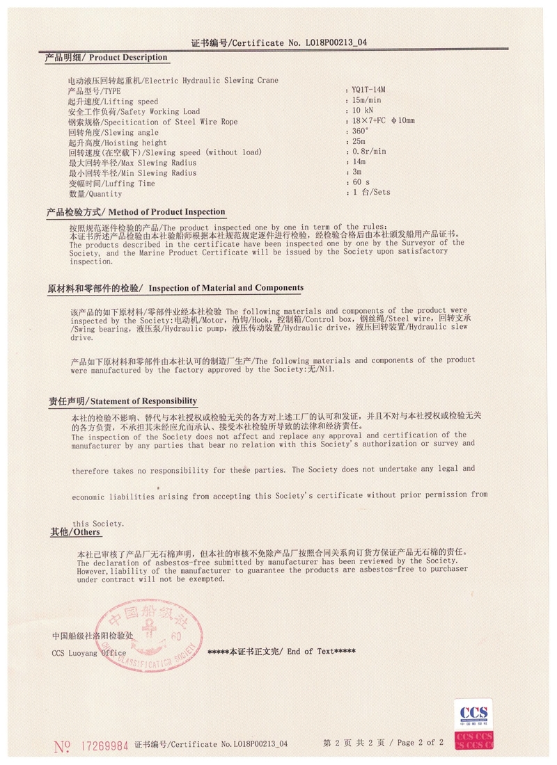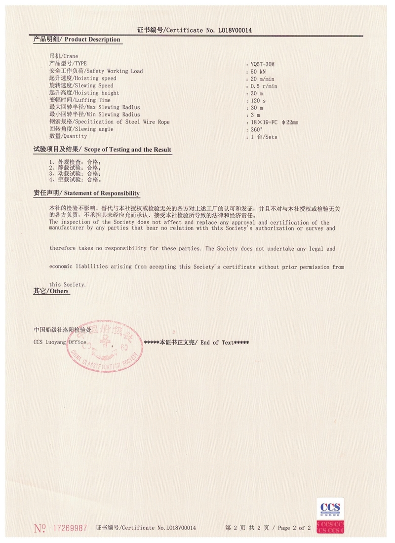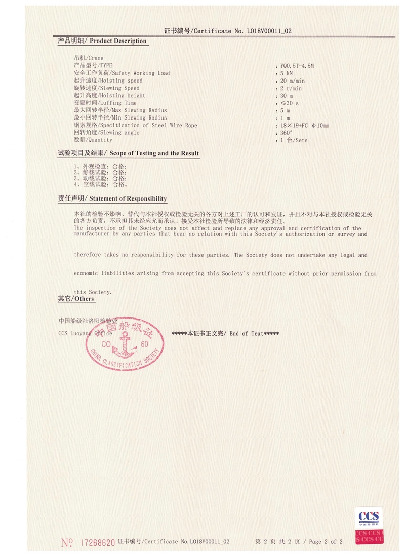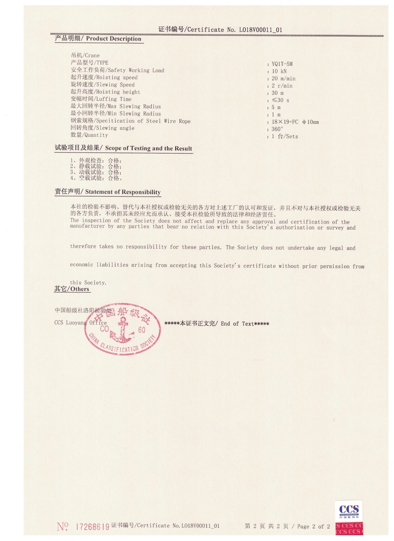 電動(dòng)葫蘆門(mén)式起重機(jī)實(shí)驗(yàn)合格證   中國(guó)船級(jí)社CCS產(chǎn)品證書(shū)