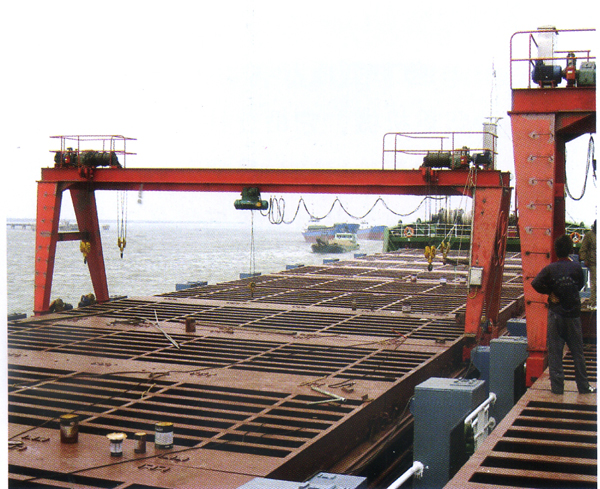 本起重機(jī)安裝在船舶甲板上,軌道鋪設(shè)在船舶甲板兩側(cè),吊機(jī)沿軌道運(yùn)行,作業(yè)面覆蓋整個(gè)船舶甲板上面。其設(shè)備專門用于起吊艙蓋,也可吊運(yùn)其他物品。主梁兩端安裝有兩套卷?yè)P(yáng)系統(tǒng),同時(shí)可操作四個(gè)吊鉤,此吊鉤具有同升同降功能,以滿足起吊艙蓋平穩(wěn)起升和降落。主梁下端安裝有一臺(tái)電動(dòng)葫蘆,也可吊運(yùn)其他物品,以滿足不同需求。